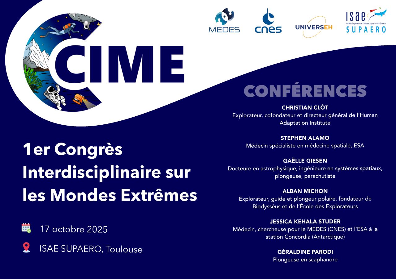 Nous participons à la première édition du congrès CIME qui réunira chercheurs, professionnels, enseignants et acteurs de terrain autour d’une même passion : 𝐥’𝐞𝐱𝐩𝐥𝐨𝐫𝐚𝐭𝐢𝐨𝐧 𝐝𝐞𝐬 𝐞𝐧𝐯𝐢𝐫𝐨𝐧𝐧𝐞𝐦𝐞𝐧𝐭𝐬 𝐥𝐞𝐬 𝐩𝐥𝐮𝐬 𝐞𝐱𝐭𝐫𝐞̂𝐦𝐞𝐬 𝐝𝐞 𝐧𝐨𝐭𝐫𝐞 𝐩𝐥𝐚𝐧𝐞̀𝐭𝐞… 𝐞𝐭 𝐚𝐮-𝐝𝐞𝐥𝐚̀. Au programme : six conférences inspirantes sur les thèmes Santé, cognition et performance humaine, Technologies & innovation, Environnements & systèmes abordés.