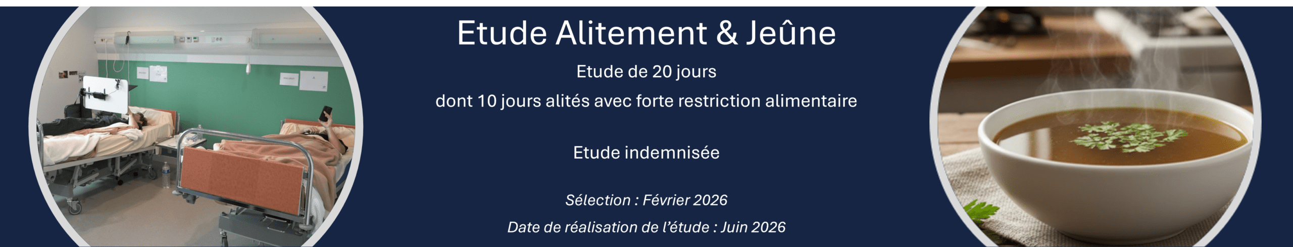 Cette étude, menée à la demande du Centre National d’Etudes Spatiales (CNES), a pour but essentiel d’étudier les effets de l’association du jeûne (restriction alimentaire) et de l’impesanteur simulée par alitement pendant 10 jours chez 10 hommes en bonne santé.  L’étude dure au total 20 jours (+1 jour de suivi), incluant la période d’alitement et les phases pré et post alitement.