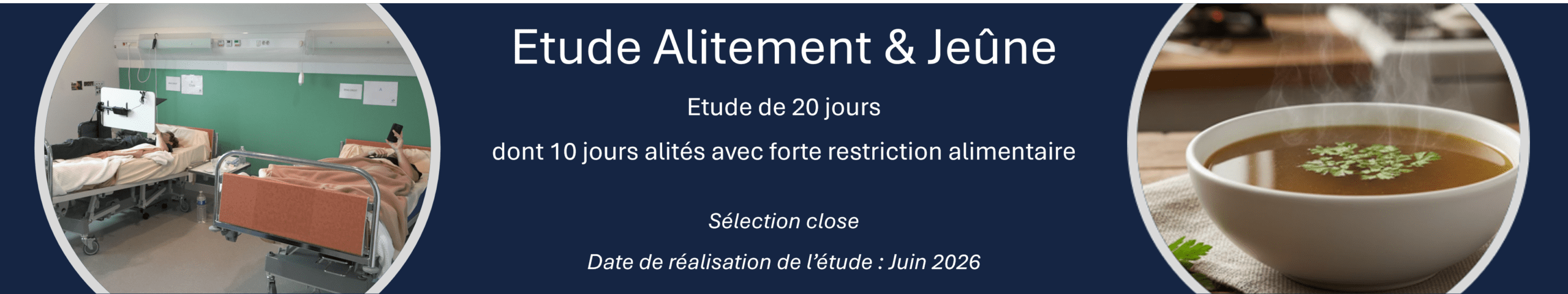 Cette étude, menée à la demande du Centre National d’Etudes Spatiales (CNES), a pour but essentiel d’étudier les effets de l’association du jeûne (restriction alimentaire) et de l’impesanteur simulée par alitement pendant 10 jours chez 10 hommes en bonne santé. L’étude dure au total 20 jours (+1 jour de suivi), incluant la période d’alitement et les phases pré et post alitement.